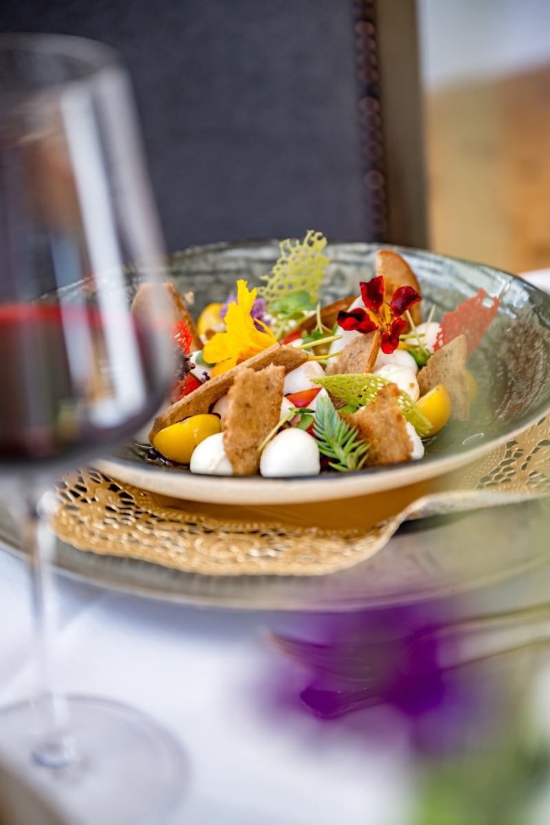 - Während des Aperitifs servieren wir im Glas: Geräucherte Entenbrust | Feldsalat | Marillenkompott